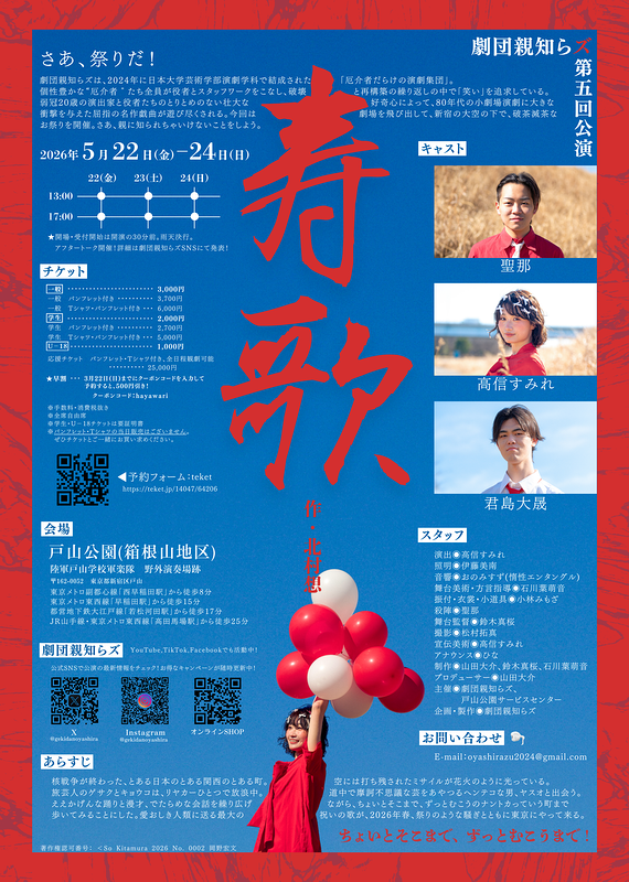| その他注意事項 | ※本公演(東京公演)では野外劇場での上演となります。雨天決行ではございますが、警報発令時などは公演中止することがあります。 ※本公演(東京公演)では、会場内でのパンフレット・Tシャツの販売はございません。チケットとご一緒にお買い求めください。 ※U-18は、ご観劇日に18歳以下のお客様対象のお席になります。 ※学生チケット及びU-18は、当日身分証明書を確認させて頂きます。身分証明書を確認できない場合は、差額をお支払い頂くことをご了承ください。 ※学生チケット及びU-18は対象外のお客様への譲渡、変更はいかなる場合においてもお受けできません。 ※チケット購入後のお客様都合によるキャンセル及び日時変更、座種変更等は対応いたしかねますのでご了承ください。 劇団親知らズSNS Instagram @gekidanoyashira https://www.instagram.com/gekidanoyashira?igsh=MXBsc2w4aGQ1Z3I4Zg== X @gekidanoyashira https://x.com/gekidanoyashira?s=21 https://www.facebook.com/share/1BuJ46P6Ce/?mibextid=wwXIfr LINE @053rpzcx https://lin.ee/hyoHDsH TikTok @oyashirazu_gekidan https://www.tiktok.com/@oyashirazu_gekidan?_t=ZS-8y10WmL3ufB&_r=1 YouTube https://youtube.com/channel/UC9QeF4HewQGJRJudEO9cN4w?feature=shared 劇団親知らズオンラインSHOP(チケット購入者に限り、会場内での引き渡し可能) https://shopoyashira.square.site/ |